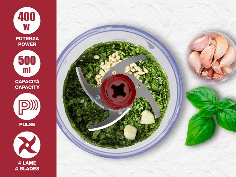 Compatto, pratico e versatile, il BEPER 4Blade è il tritatutto elettrico perfetto per l’uso quotidiano. Il contenitore da 500 ml in plastica resistente e il sistema a doppia lama in acciaio inox garantiscono una tritatura omogenea ed efficace di verdure, carne, frutta secca ed erbe.