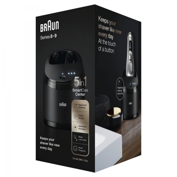 La stazione di pulizia Braun 5 in 1 seleziona in modo intelligente l’intensità di pulizia adatta al tuo rasoio. Inoltre, si prende cura delle lame per mantenere le prestazioni del rasoio ed esegue l’asciugatura attiva e la ricarica intelligente. Il dispositivo rimuove i peli residui e le particelle di pelle con una formula detergente a base di alcol. Gli oli altamente efficaci aiutano a mantenere le massime prestazioni di rasatura riducendo l’attrito tra la lamina da barba e il taglierino. Il rasoio si asciuga completamente in 45 minuti, si ricarica completamente in un’ora, può essere ricaricato per una singola rasatura in 5 minuti con una ricarica rapida.La stazione di pulizia (SmartCare Center) è completamente compatibile con i rasoi elettrici da uomo Series 9 e Series 8. Usa Braun Clean &
