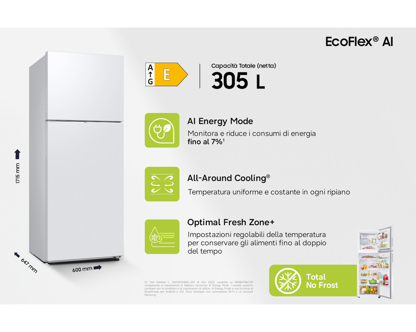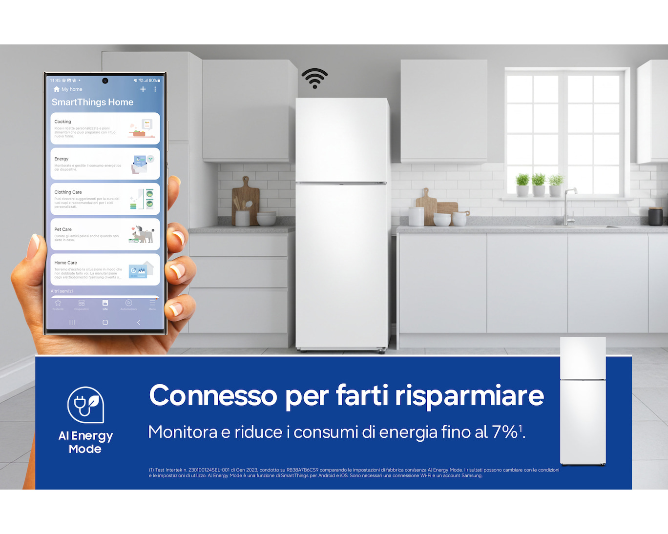 - AI Energy Mode (SmartThings): Monitora le tue abitudini di utilizzo e ottimizza il funzionamento del compressore e il ciclo di sbrinamento, permettendoti di risparmiare fino al 7% di energia extra rispetto al funzionamento standard.