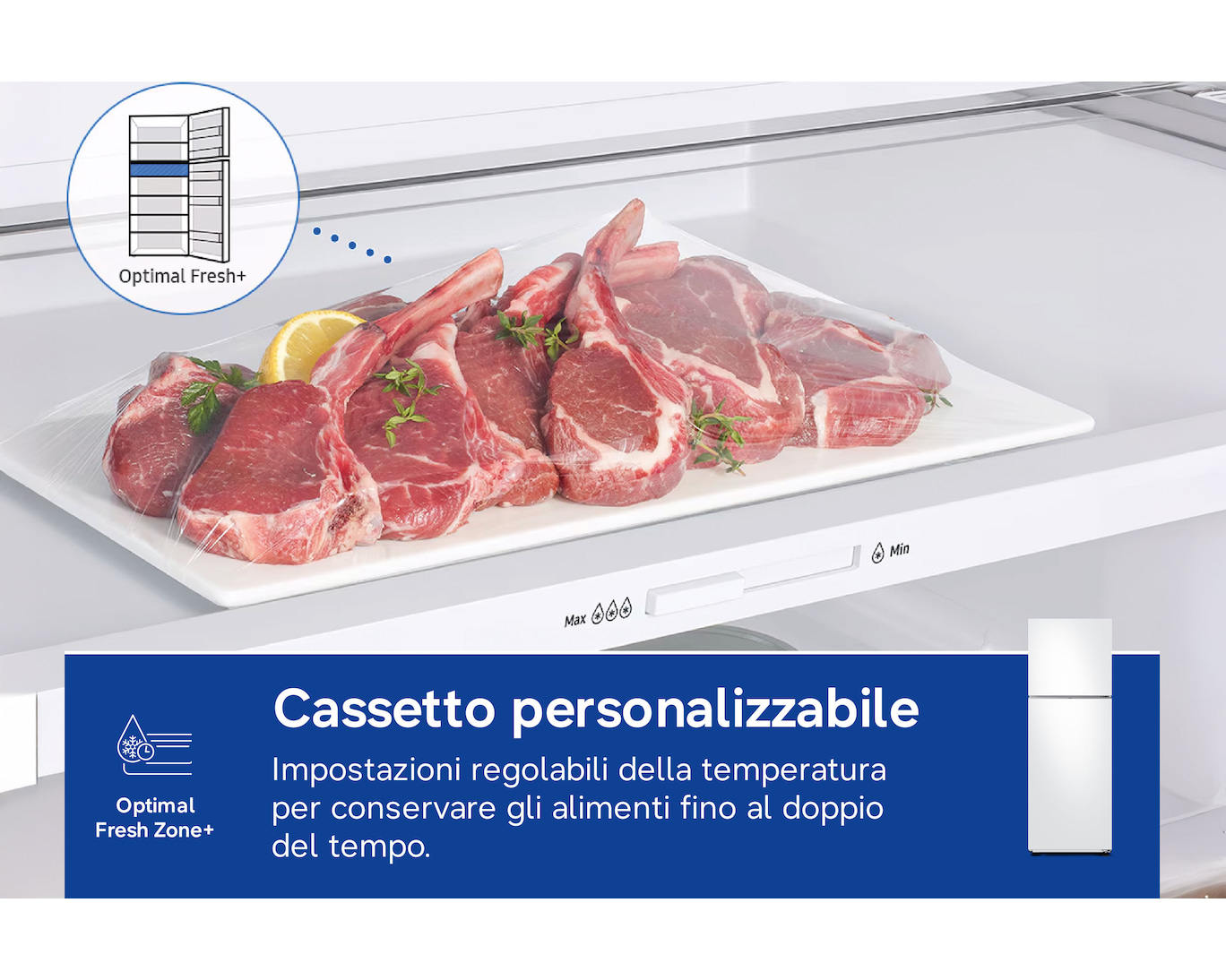 - Optimal Fresh+: Un comparto flessibile con 4 impostazioni regolabili. La modalità “Soft Freeze” è ideale per carne e pesce, mantenendone la freschezza e il gusto naturale fino a due volte più a lungo rispetto ai sistemi tradizionali.