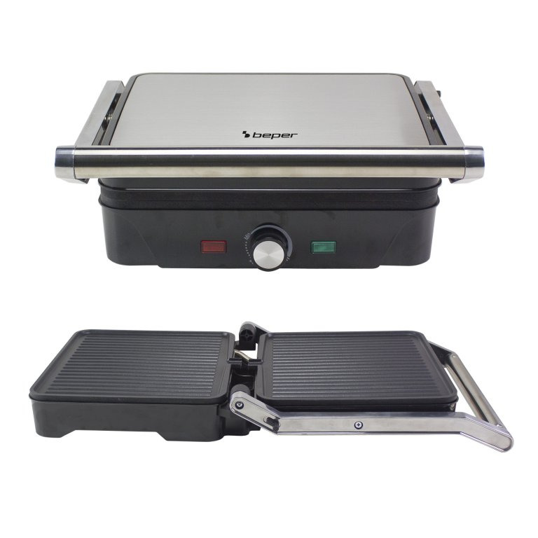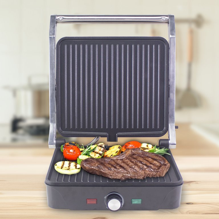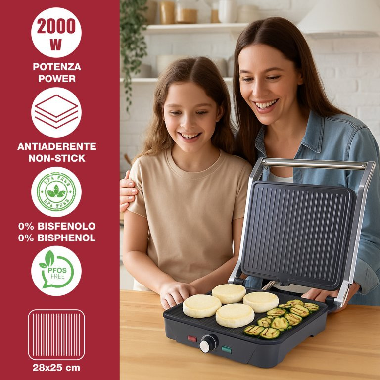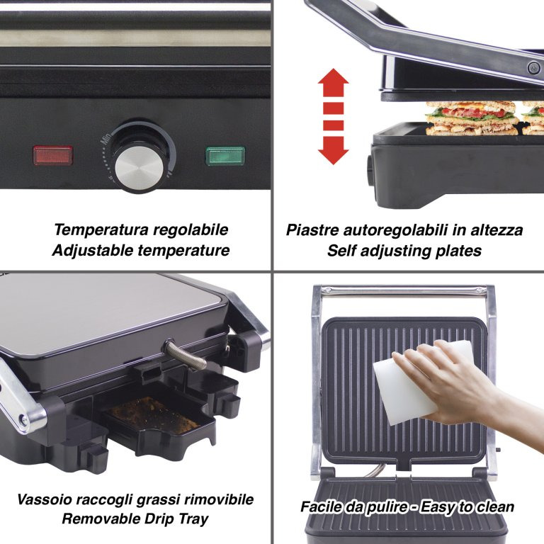 Griglia, tosta e cuoci come un vero chef con un solo apparecchio versatile! Design robusto ed elegante con struttura in acciaio e plastica e bracci rinforzati in lega di alluminio. Piastre in alluminio pressofuso con rivestimento antiaderente: cottura uniforme e pulizia facile. Apertura doppia (90° e 180°) per adattarsi a ogni ricetta e spessore del cibo. Maniglia in acciaio fredda al tatto per un utilizzo sicuro e confortevole. Temperatura regolabile con termostato. Spie luminose che indicano accensione e temperatura raggiunta. Vassoio raccogli-grassi salvaspazio, removibile e lavabile in lavastoviglie