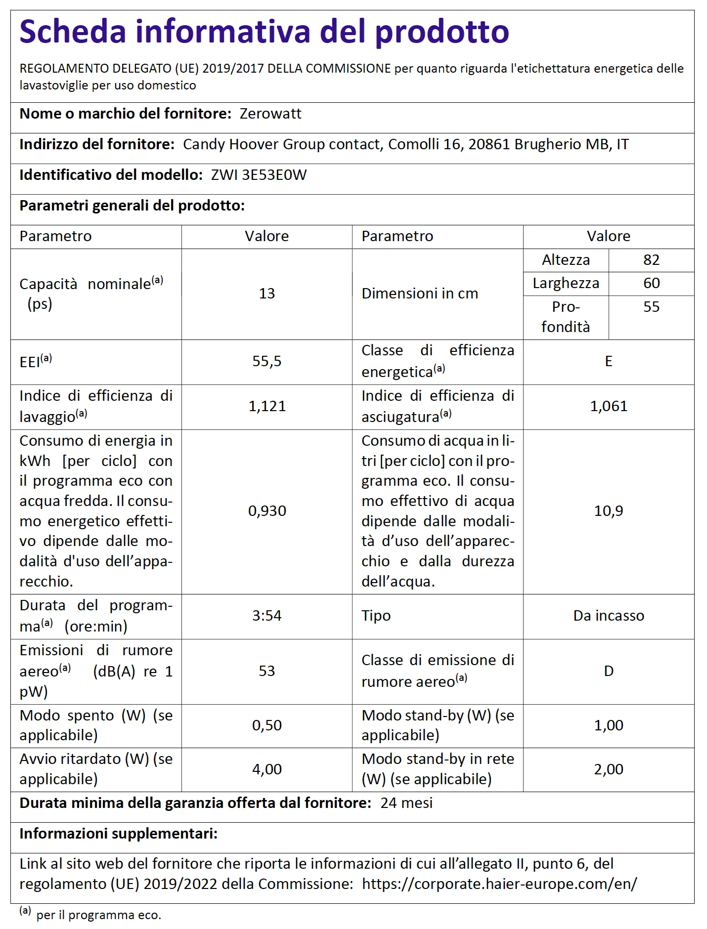 Lavastoviglie ZEROWATT 13 Coperti Classe E Da Incasso