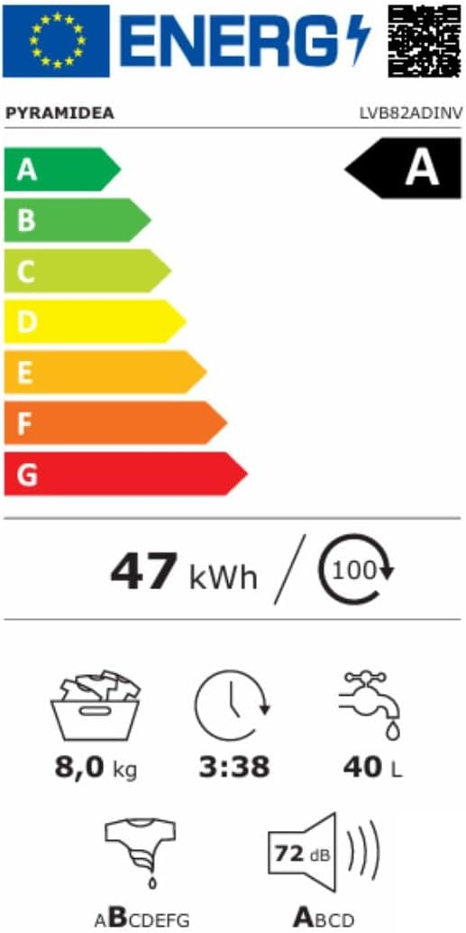 - Classe Energetica A: Massima efficienza garantita con un consumo di soli 47 kWh per 100 cicli, riducendo drasticamente i costi in bolletta.